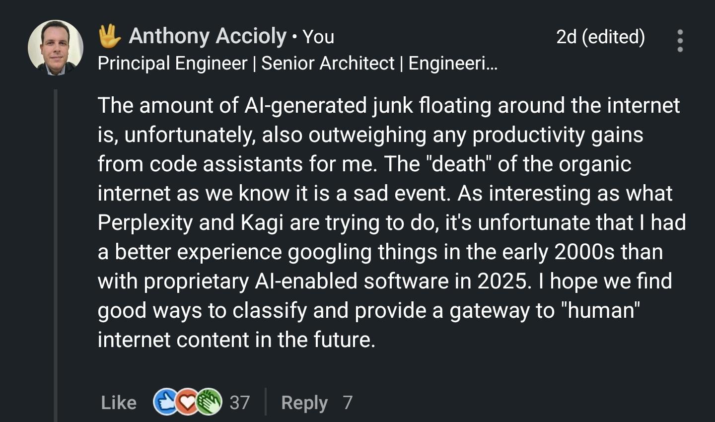 LinkedIn post with 37 reactions and 7 replies reading: "The amount of AI-generated junk floating around the internet is, unfortunately, also outweighing any productivity gains from code assistants for me. The "death" of the organic internet as we know it is a sad event. As interesting as what Perplexity and Kagi are trying to do, it's unfortunate that I had a better experience googling things in the early 2000s than with proprietary AI-enabled software in 2025. I hope we find good ways to classify and provide a gateway to "human" internet content in the future."