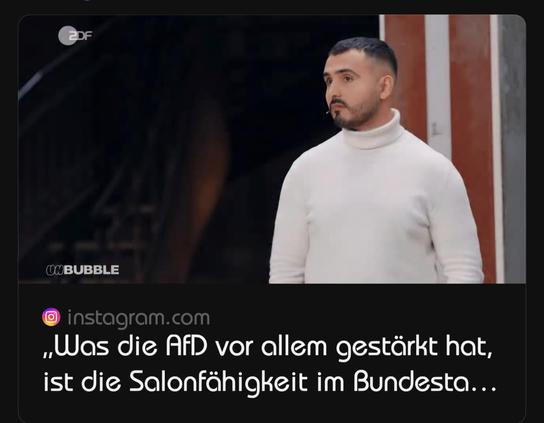 "Was die #AfD vor allem gestärkt hat, ist die #Salonfähigkeit im #Bundestag & in der #Gesellschaft von den anderen Parteien. Eine #CDU, die mit der #AfD mindestens #Brüder im #Geiste ist, das sehen wir an den ganzen #Slogans, die kommen von dieser #Partei. Und das ist absolut #Teil des #Problems.“