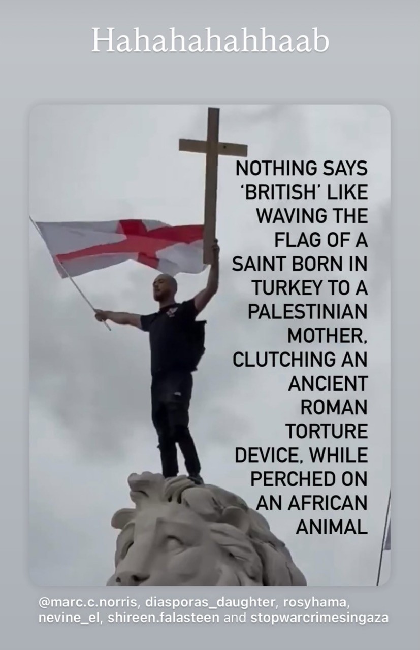 Nothing Says ‘British’ like waving the flag of a saint born in ( the Ottoman Empire ) reportedly Palestine, clutching a Roman torture device standing on top of an African Animal. #ThisIsEngland #GeorgeCross #FarRight #Irony