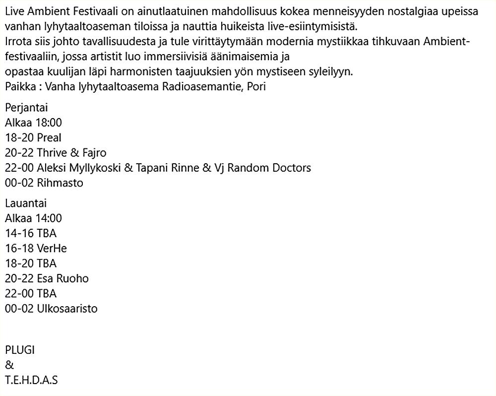 #LiveAmbientFestival #LiveAmbientFestivaali #ambient #electronic #Preal #Thrive #Fajro #AleksiMyllykoski #TapaniRinne #VJRandomDoctors #Rihmasto #VerHe #EsaRuoho #Ulkosaaristo #Lyhytaaltoasema #Pori #Finland