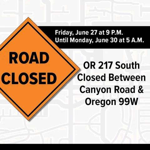 OR 217 South will be fully closed between Canyon Road and OR 99W from Friday, June 27 at 9 PM to Monday, June 30 at 5 AM.