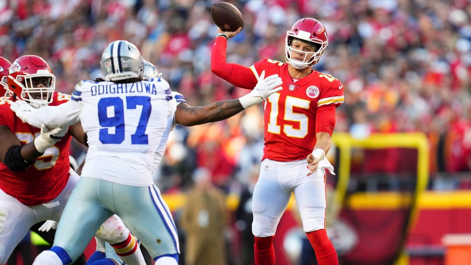 Patrick Mahomes of the Kansas City Chiefs throws the ball against the Dallas Cowboys during a game atā¦