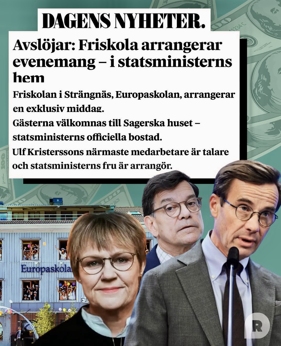 Kristerssons fru som sitter i styrelsen för en friskola (grundad av tidigare säkerhetsrådgivaren Landerholm) ska hålla en privat fest Sagerska huset, statsministerns officiella bostad.