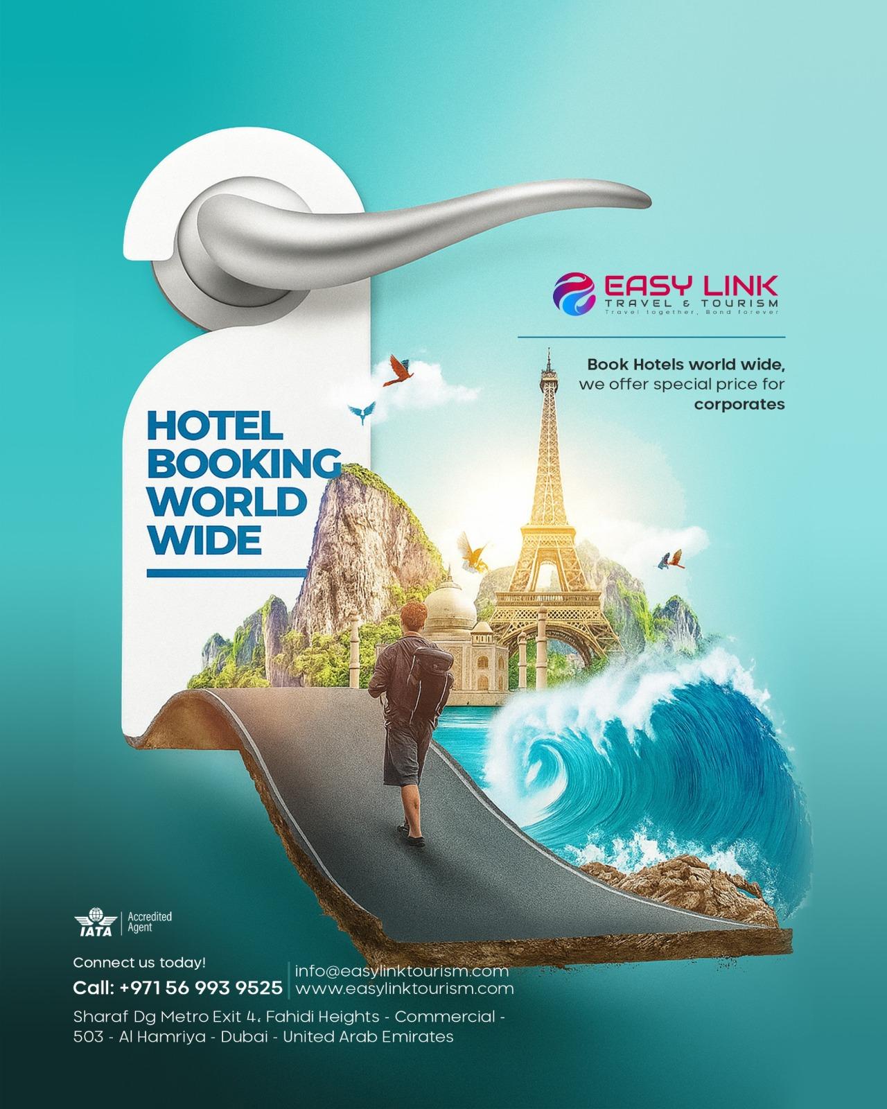 #EasyLinkTourism #HotelBookingWorldwide #BusinessTravel #CorporateRates #VacationReady #TravelMadeEasy #GlobalStay #BookYourStay #TravelDealsUAE #HassleFreeTravel #AffordableHotels