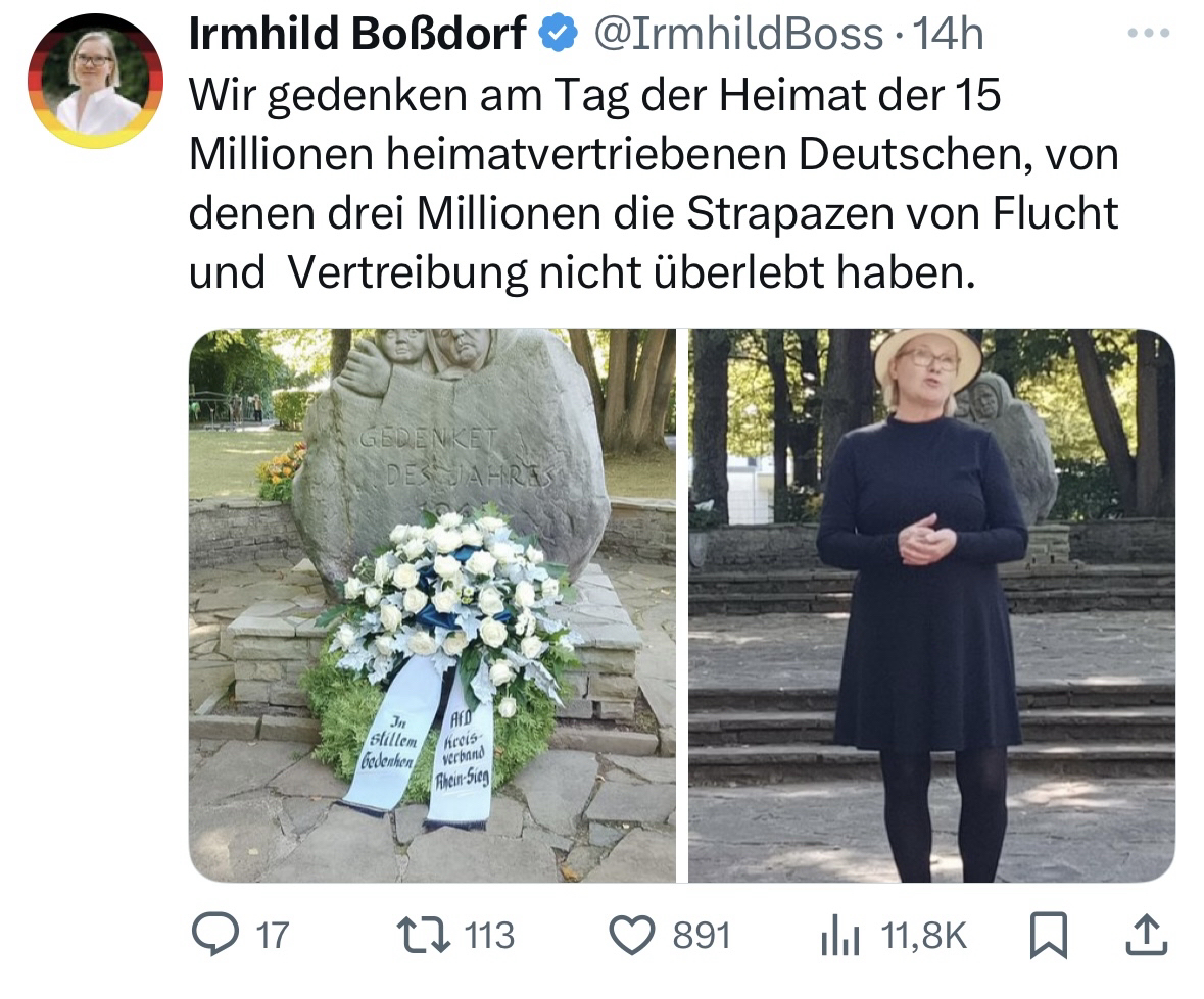 Und wieder betreibt die #AfD #Geschichtsfälschung, indem die Zahlen der Opfer von #Flucht und #Vertreibung überhöht werden. Tatsächlich wurden 12 bis 14 Mio. Deutsche vertrieben oder flüchteten, 600.000 starben (nicht 3 Mio.).