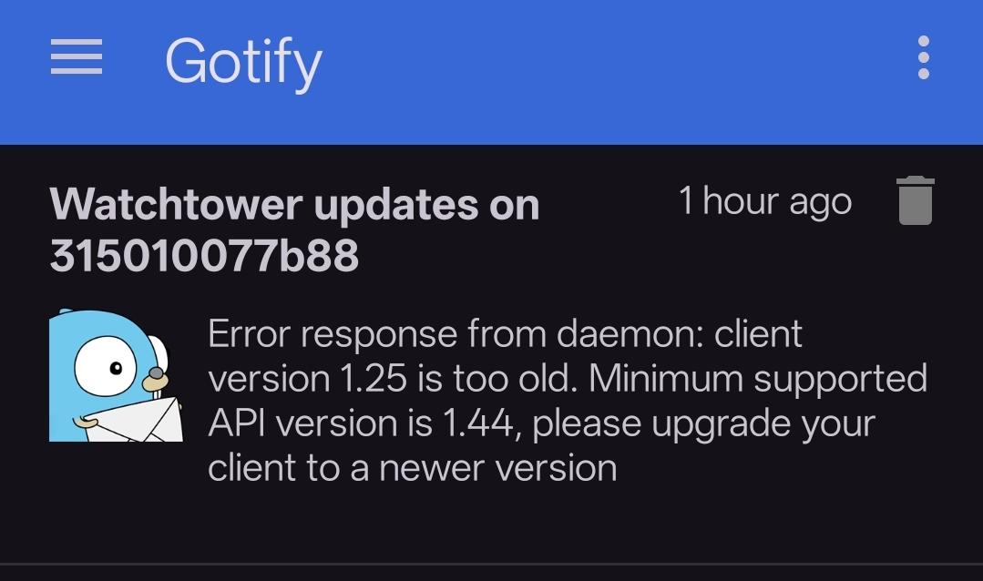 Watchtower ngừng hoạt động với cập nhật docker mới nhất! Lỗi phiên bản client 1.25 quá cũ, yêu cầu nâng cấp lên 1.44. #Watchtower #Docker #Cập Nhật #Lỗi #PhiênBản #Container #dockerupdate #watchtowererror #selfhosted #tựhost