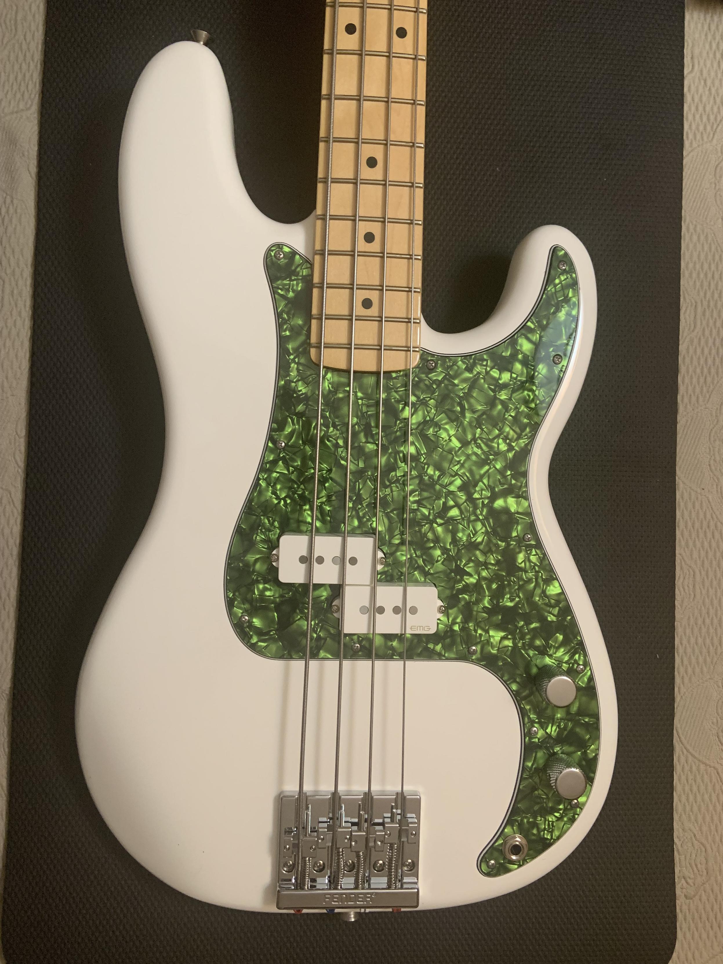 Before and after pics of my white, #MadeinMexico #Fender Player #PrecisionBass, now with white #EMG GZR #GeezerButler pickup and Lime Green Pearl pickguard from #WDMusic. I was calling it Marshmallow Mk II but now it needs a new name; Peppermint PBass?