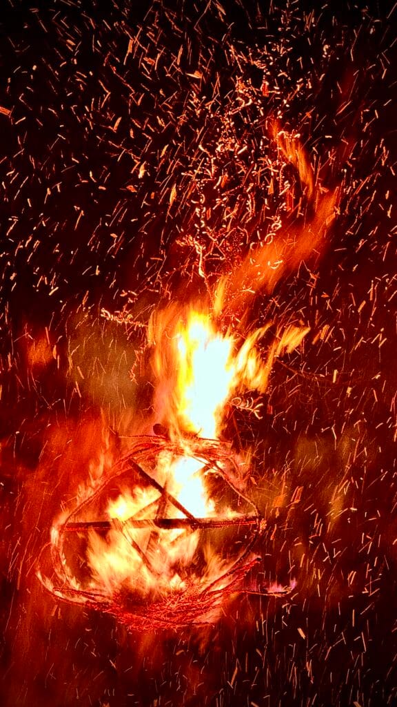 Then the ceremony began. Not in rushed aggression, but in calm determination. Torches lit at the stage were carried once more to the pyre, where each found their own way upwards. Once more I walked widdershins around the flame in my own tradition of bonding. Blood surged through my veins in fierce vitality. Belonging.