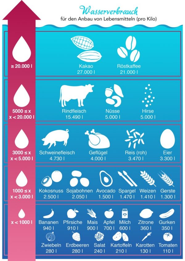 "Vor allem die Genussmittel Kakao und Kaffee verbrauchen viel Wasser: Kakao hat mit 27.000 Litern pro Kilo den höchsten Wasserverbrauch, gefolgt von Kaffee mit 21.000 Litern und Rindfleisch mit 15.490 Litern.