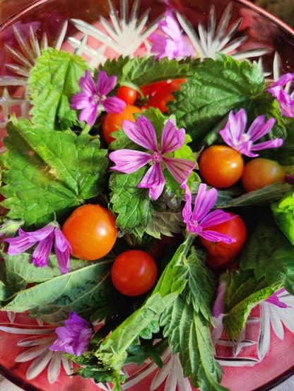 #wildfood #orties #nettle #rucola #fleursdemauve #MallowFlowers #fioredimalva #tomatoes #pomodoro salade fleurie