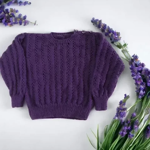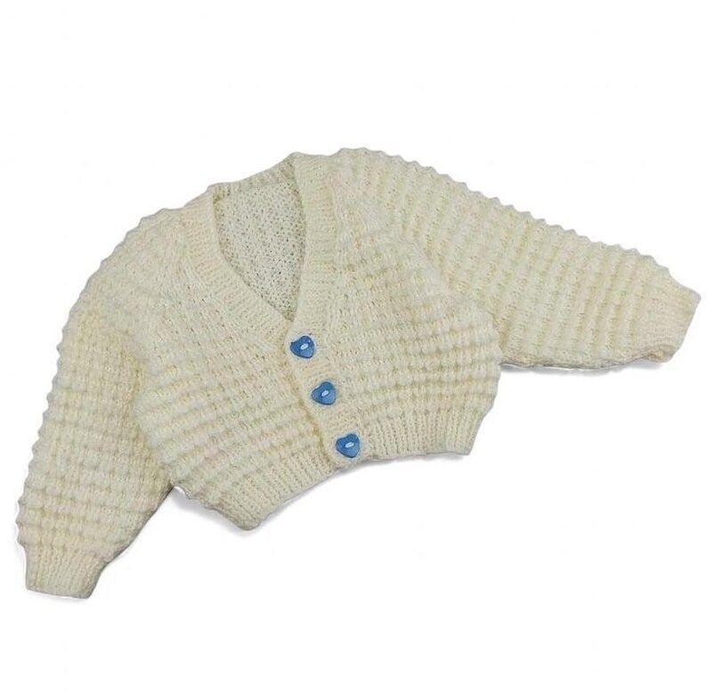 A cream hand-knitted baby cardigan with textured detail and blue heart-shaped buttons is displayed on a white background