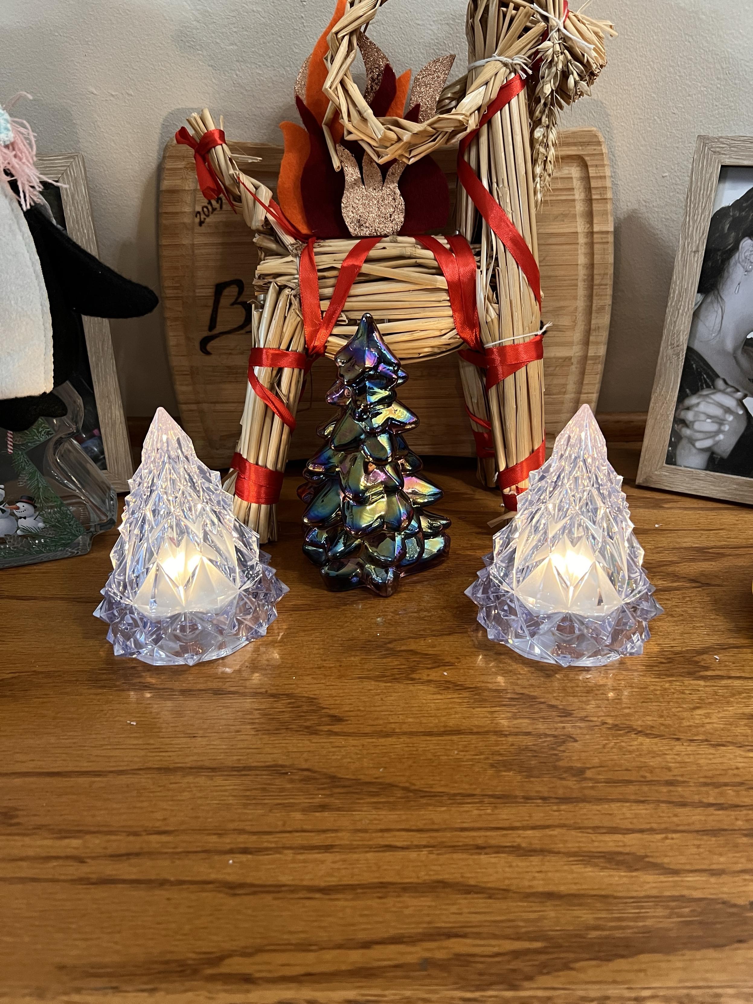 The plastic light up trees are from IKEA today, and the carnival glass tree from the antique store. In the background is the usual mini Gavlëbocken that goes out this time of year (complete with felt fire, courtesy of one of my crafty friends!)