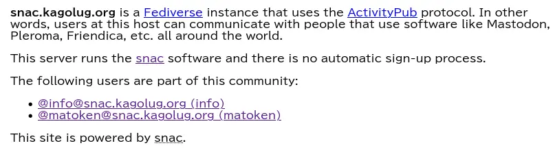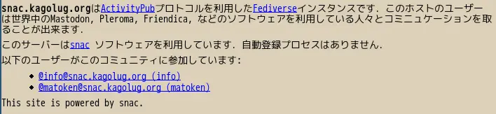 さくらのナレッジに軽量ActivityPub Server のsnac についての記事を寄稿しました. さくらインターネットのさくらのナレッジにsnacの記事を寄稿 – matoken’s blog ここに書かなかったsnac のことをいくつか書いていこうと思います. 今日はsnac でのWelcome pageのカスタマイズについて. […]@sebsauvage touxtes ces adelphes qui luttent pour leur reconnaissance/existence IRL et dont les liens interpersonnels, sociaux ou intimes sont tissés dans une toile numérique toxique. L'émancipation semble proche mais si loin aussi. :mastodon_oops: