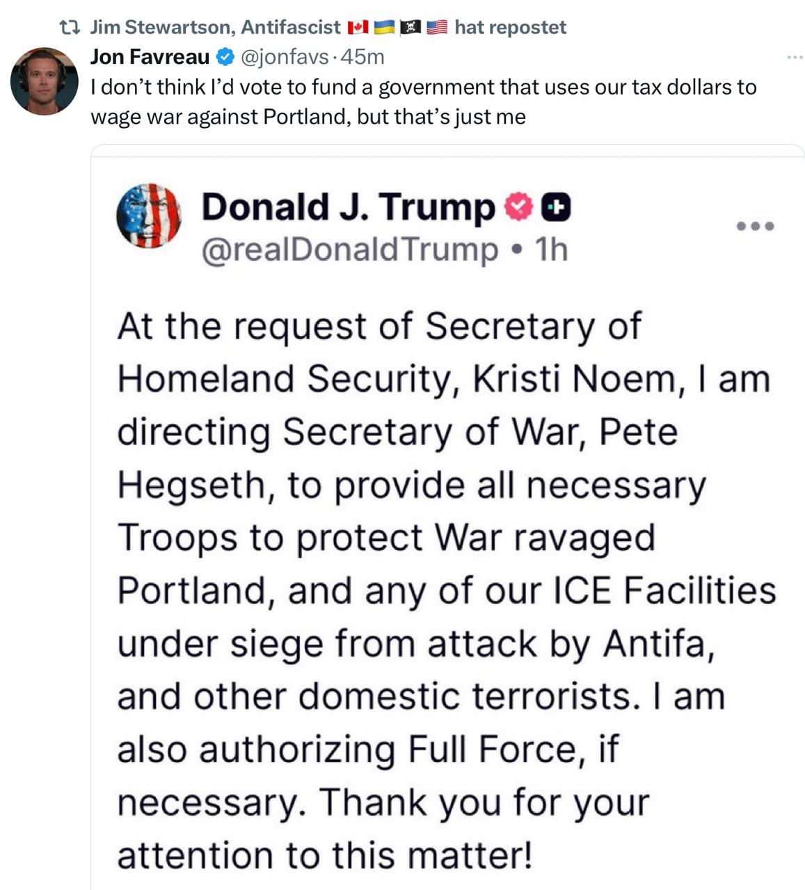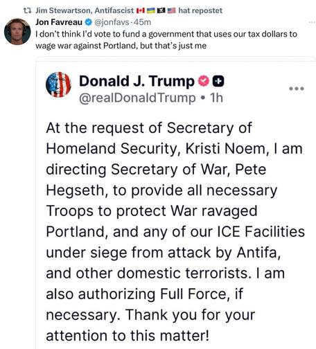 Der "Kriegsminister" soll Truppen ins "kriegsverwüstete" Portland schicken, das von der Antifa belagert wird... 🤯