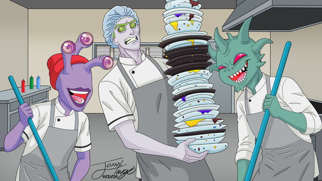 Cooking up chaos in the kitchen, where the ingredients scream louder than the staff. I'm pretty sure the main course is winning the fight!