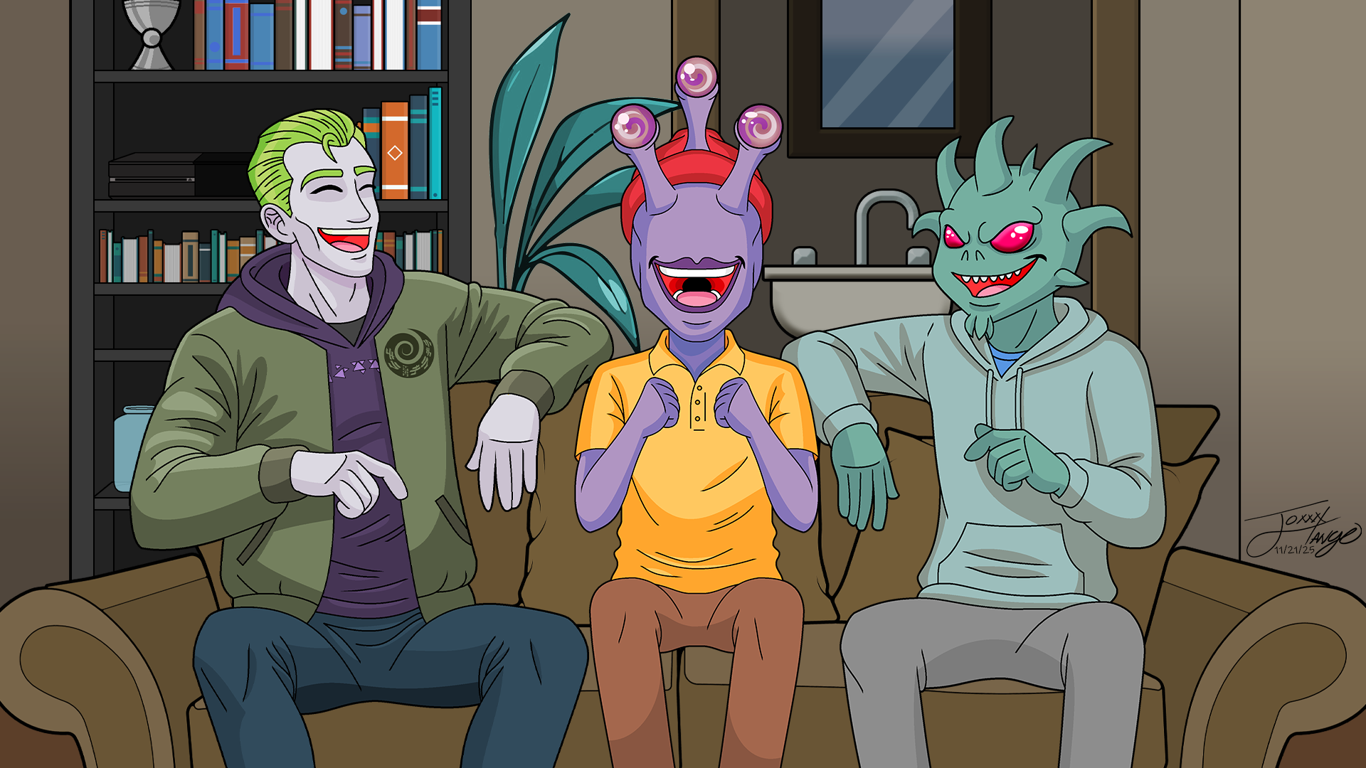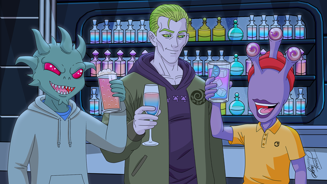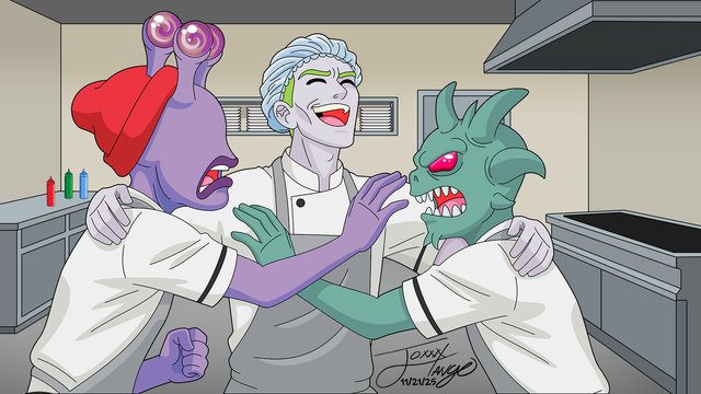 Concept art of Anbis, and Beksina Camlorn. They are a newlywed couple raising their 800 offspring in a cramped two-bedroom apartment on a Paratess Complex Cruiser.