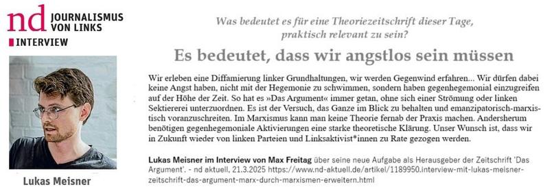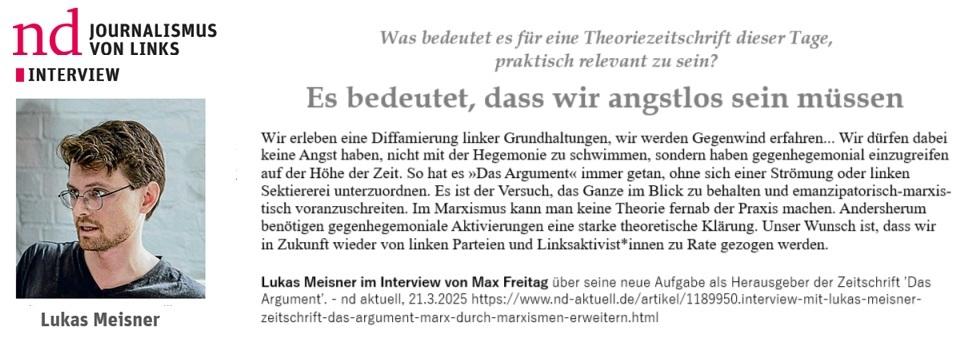 Lukas Meisner im Interview von Max Freitag zu seiner neuen Aufgabe als Herausgeber der Zeitschrift 'Das Argument'. nd aktuell, 21.3.2025 https://t1p.de/c6mxq · #ArgumentVerlag