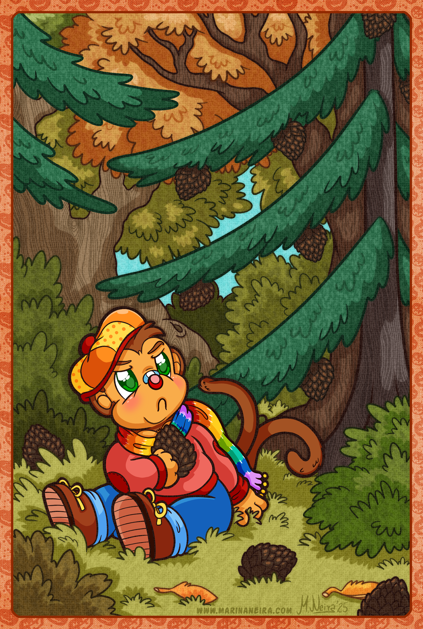 #MastoArt #Art #Illustration #ArtistsOfMastodon #SquelflandArt #Anthro #Animals #Cartoon #Pinecone #Forest #Fall #Autumn #Monkey