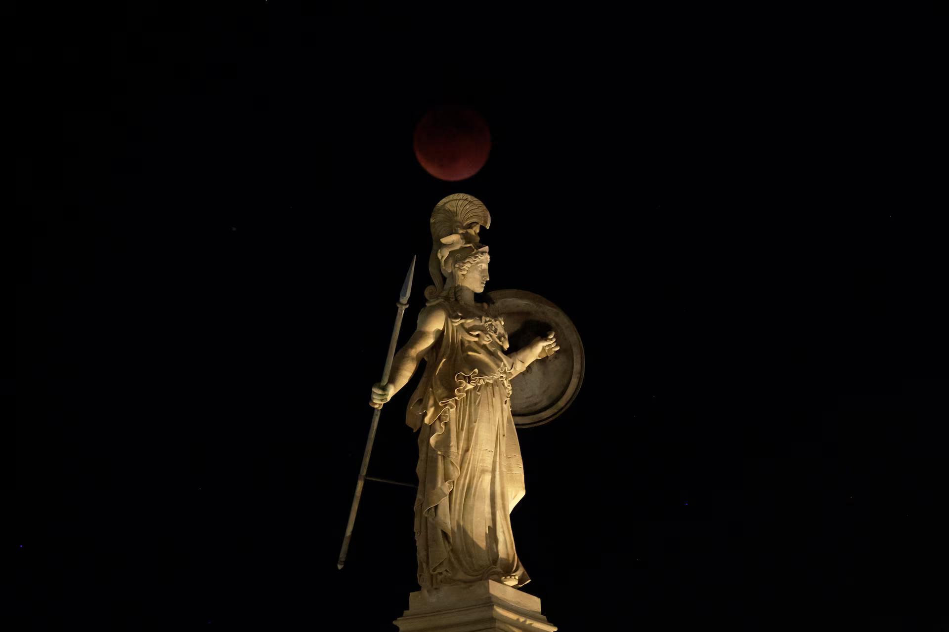 A full moon rises during an eclipse behind the statue of ancient Athena goddess in Athens, Greece, September 7.