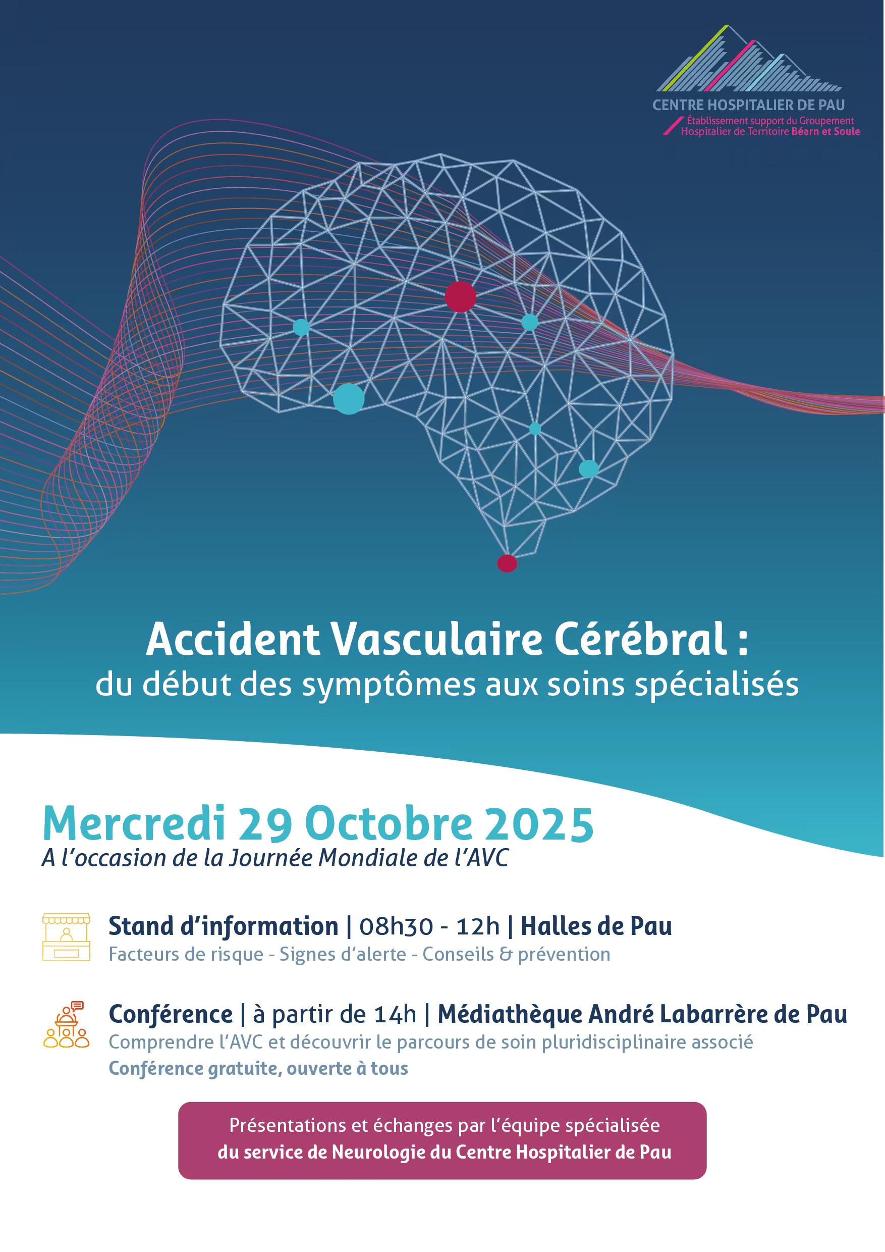 À cette occasion, l'équipe de neurologie du centre hospitalier de #Pau vous propose des ateliers de dépistage et de prévention le matin aux Halles de Pau et une conférence sur la prise en soins pluridisciplinaire de l'AVC, à la médiathèque André Labarrère à partir de 14h.