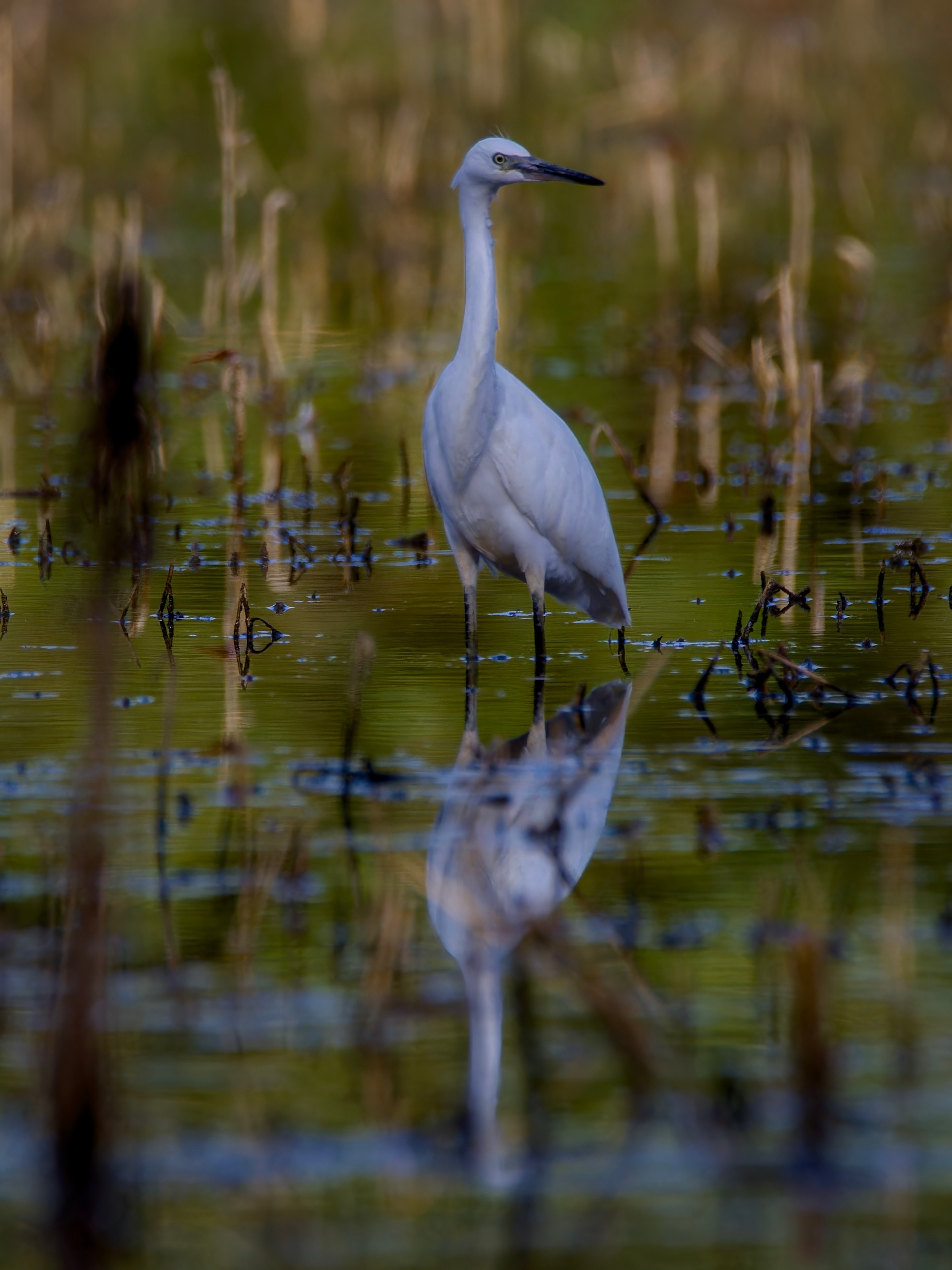 Una garzetta, Egretta garzetta, si specchia nell'acqua palustre al Parco Le Folaghe.