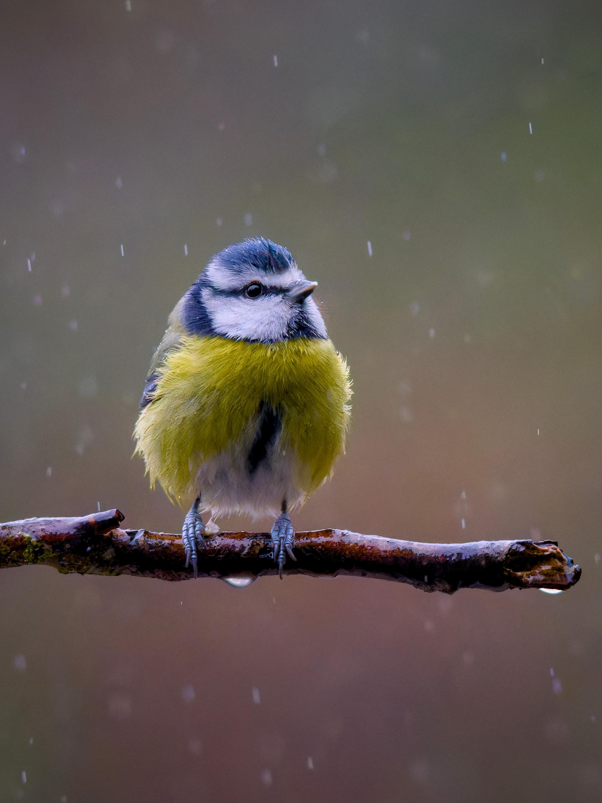 Una cinciarella, Cyanistes caeruleus, su un piccolo ramo in una giornata piovosa.