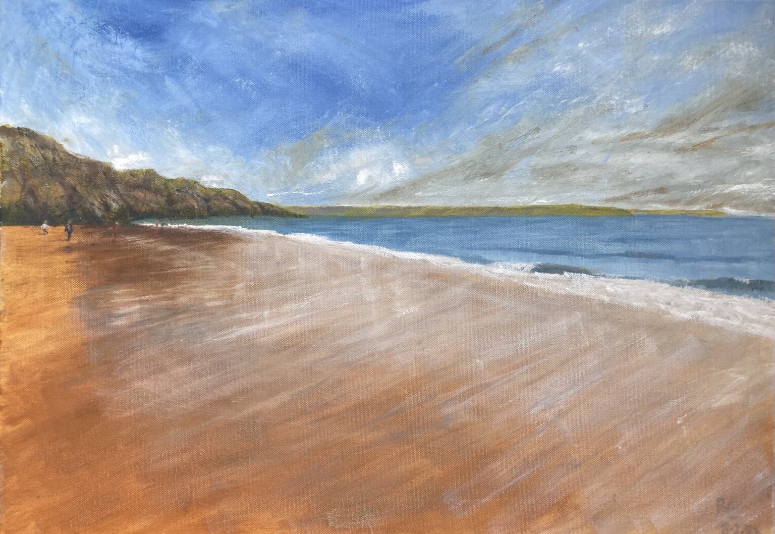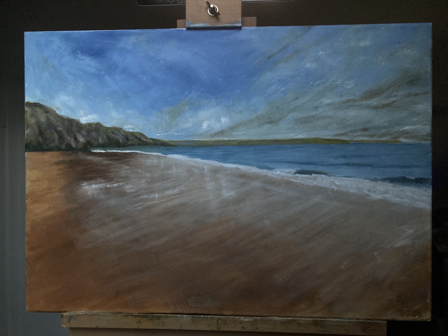 On the final straight - maybe finished even. Need to sleep on it. Oil of Barafundle Bay - 59cm x 42 cm #pembrokeshirecoast #barafundlebay