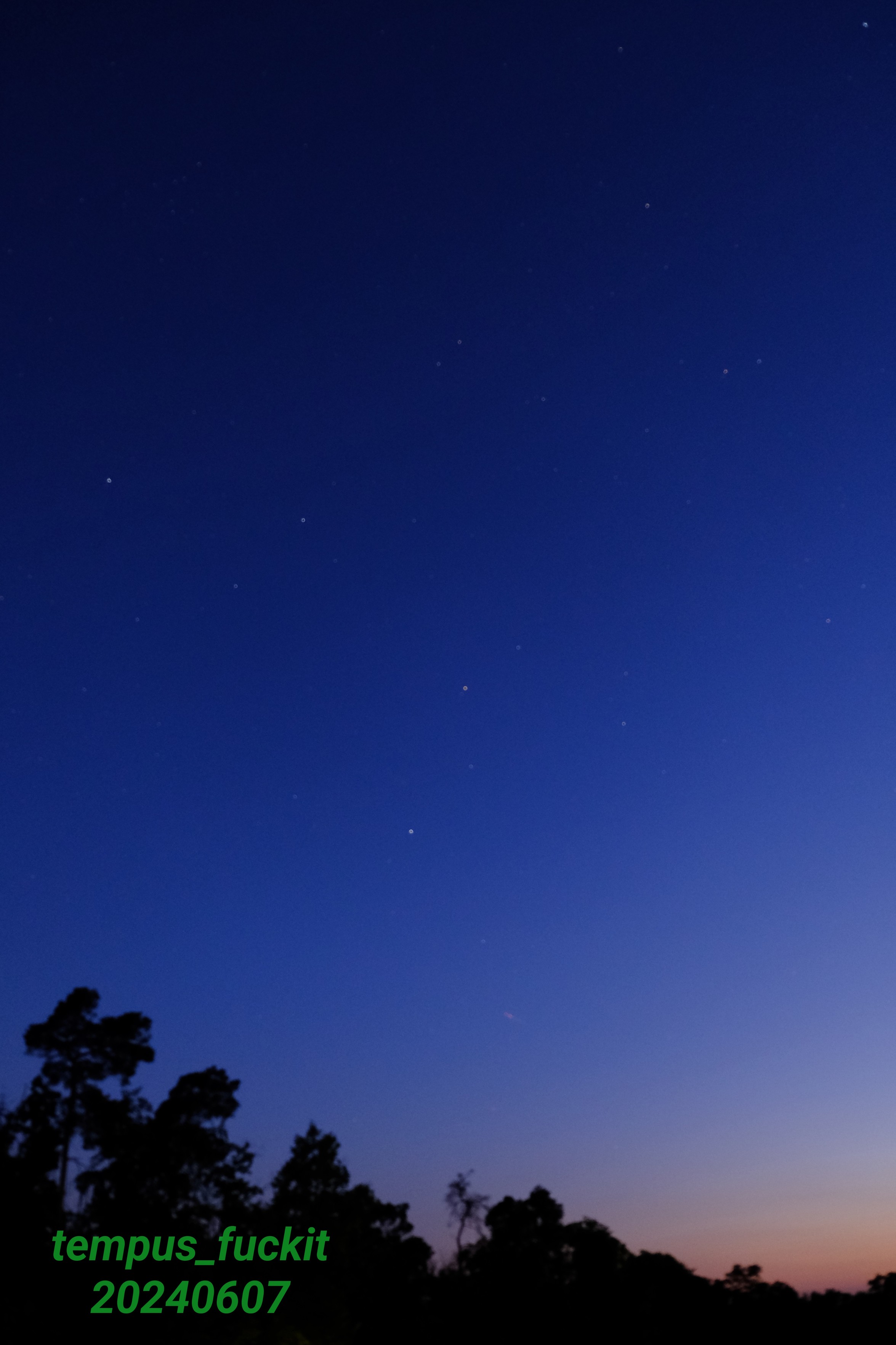 Fotografie (eine Sekunde belichtet) des Himmels kurz nach dem Sonnenuntergang. In der rechten unteren Ecke ist noch der orangene Schein des Restlichts der Sonne zu sehen. Je weiter links oben im Bild, desto mehr dominieren dunklerwerdende Blautöne. Zwischendrin erkennt man Sterne. Am unteren Rand und in der rechtsunteren Ecke sind schemenhaft Baumkronen zu erkennen. Rechts unten befindet sich auch mein Wasserzeichen im üblichen giftgrün.