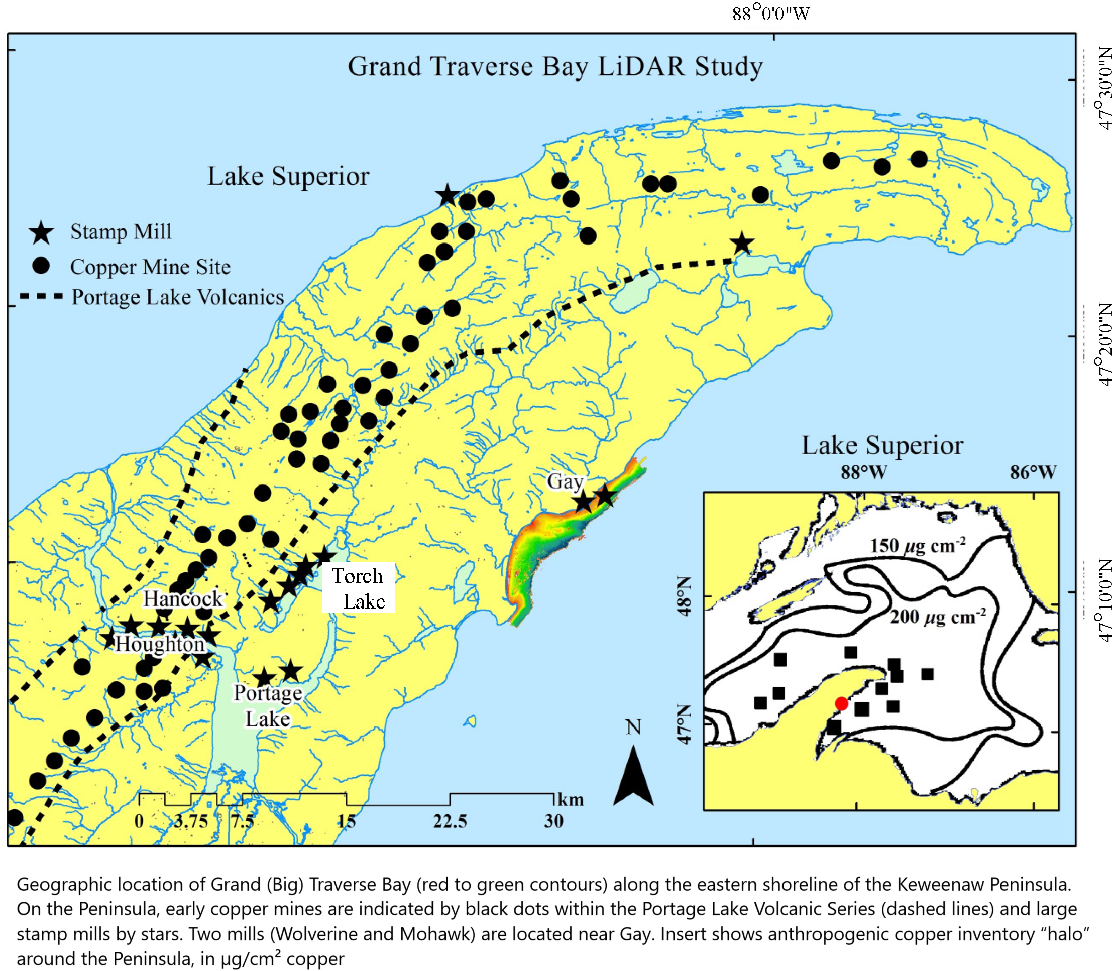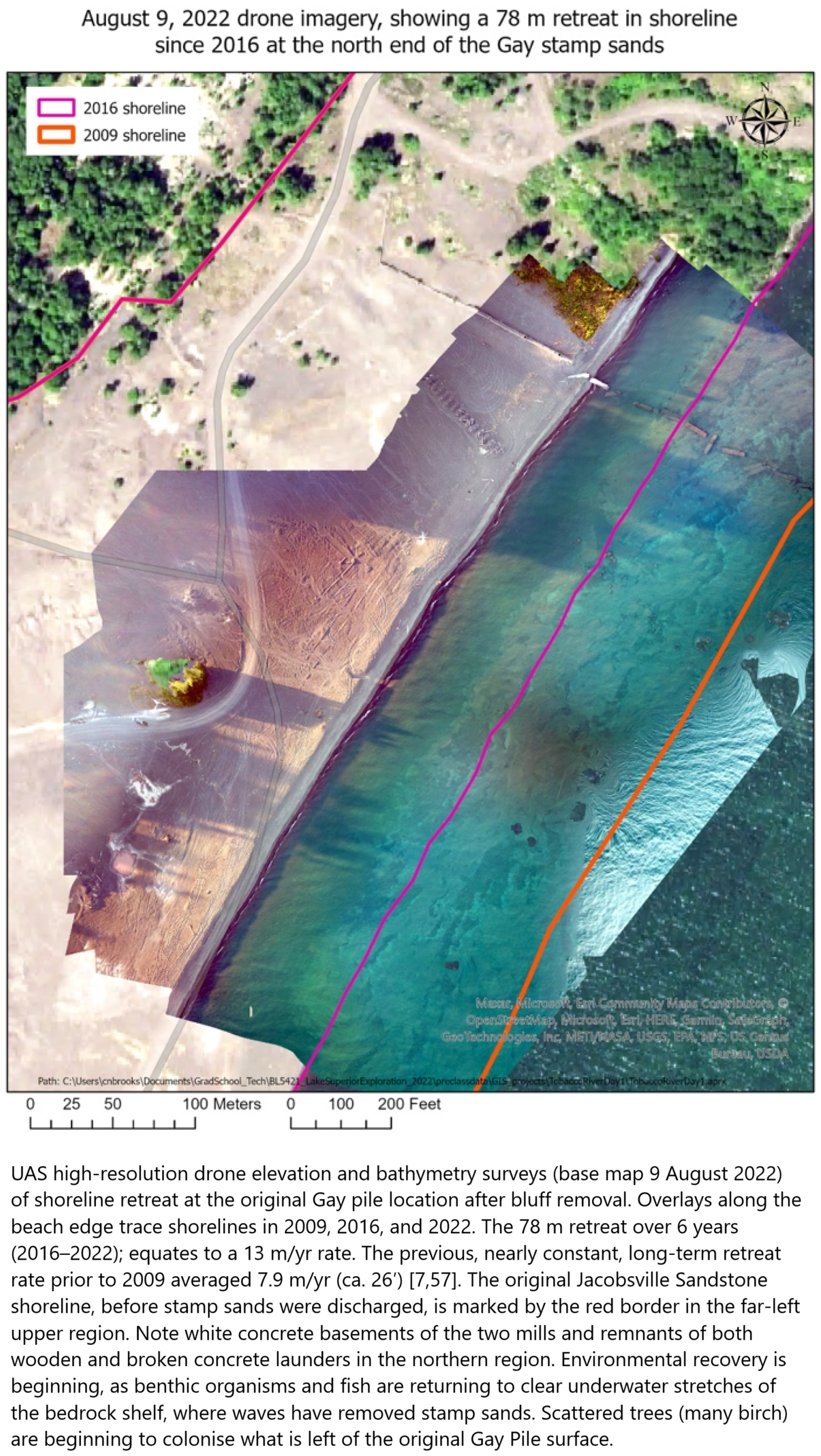 ![aerial images - UAS high-resolution drone elevation and bathymetry surveys (base map 9 August 2022) of shoreline retreat at the original Gay pile location after bluff removal. Overlays along the beach edge trace shorelines in 2009, 2016, and 2022. The 78 m retreat over 6 years (2016–2022); equates to a 13 m/yr rate. The previous, nearly constant, long-term retreat rate prior to 2009 averaged 7.9 m/yr (ca. 26′) [7,57]. The original Jacobsville Sandstone shoreline, before stamp sands were discharged, is marked by the red border in the far-left upper region. Note white concrete basements of the two mills and remnants of both wooden and broken concrete launders in the northern region. Environmental recovery is beginning, as benthic organisms and fish are returning to clear underwater stretches of the bedrock shelf, where waves have removed stamp sands. Scattered trees (many birch) are beginning to colonise what is left of the original Gay Pile surface.](https://files.mastodon.social/cache/media_attachments/files/114/181/087/718/405/194/small/065f79c8b29e2466.png)