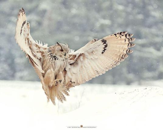 ❄️ A Siberian Eagle-Owl landing on a snow-covered rock in pure winter silence.