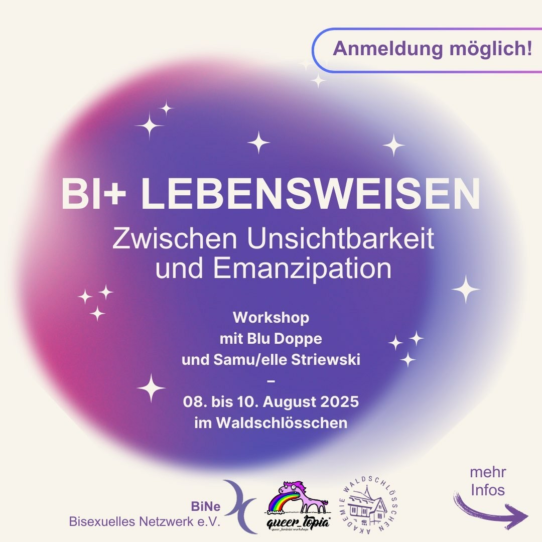 #Workshop #Anmeldung Ab sofort ist die Anmeldung zum Workshop „Bi+ Lebensweisen – zwischen Emanzipation und Unsichtbarkeit“ für den 08. bis 10. August 2025 im Waldschlössen möglich. 🩷💜💙🥳🏳️⚧️🫂🏳️🌈