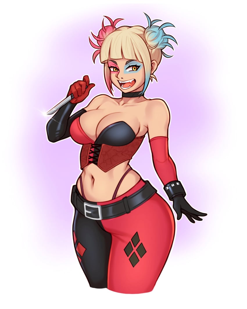 #1girl #bare_shoulders #belt #black_choker #blonde_hair #blue_hair #blunt_bangs #boku_no_hero_academia #breasts #choker #cleavage #cosplay #cowboy_shot #dc_comics #elbow_gloves #gloves #harley_quinn #harley_quinn_(cosplay) #highres #holding #holding_knife #jakuson_z #knife #large_breasts #midriff #navel #open_mouth #panty_straps #pink_hair #smile #solo #toga_himiko #two-tone_gloves #two-tone_legwear #yellow_eyes https://danbooru.donmai.us/posts/5481142