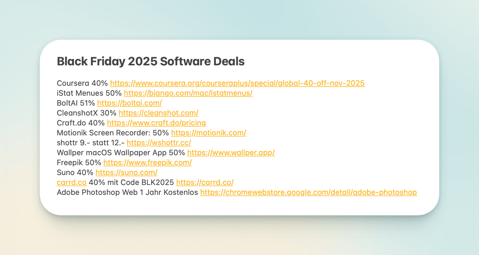 Richtig gute Black Friday Hardware Deals muss man ja leider mit der Lupe suchen, gute Software Deals gibts aber zum Glück noch weiterhin. Ich habe eine kurze Liste mit mMn guten Deals zusammengestellt. Falls ihr weitere kennt, freue ich mich über eure Empfehlungen und Teilen dieses Beitrages, damit wir eine möglichst lange Liste mit weiteren Deals erhalten!
