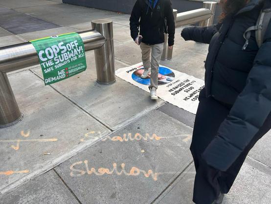 Brooklyn, NY — Transit riders gathered at Jay Street – Metrotech station around a banner with an enlarged image of MTA Board Chair and CEO Janno Lieber. Organizers from the New York Alliance Against Racist and Political Repression (NYAARPR) invited passersby to step on the image and share negative experiences with the MTA and police in the transit system.