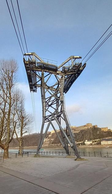 The cable car between the old town of Koblenz across the Rhine up to Ehrenbreitstein Fortress stands still in winter.