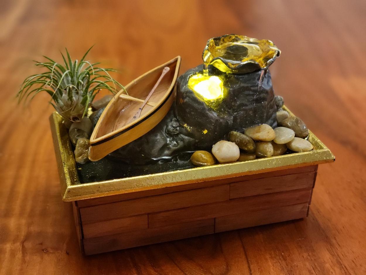 Before/after of my latest dollar store hack. I have wanted a little desktop fountain for ages. Nice ones are expensive. Cheap ones look cheap. But for $4, it was hard not to pick up this cheap dollar store fountain to mess around with. Especially when I am also currently playing with this new wood filament for use in Christmas presents.