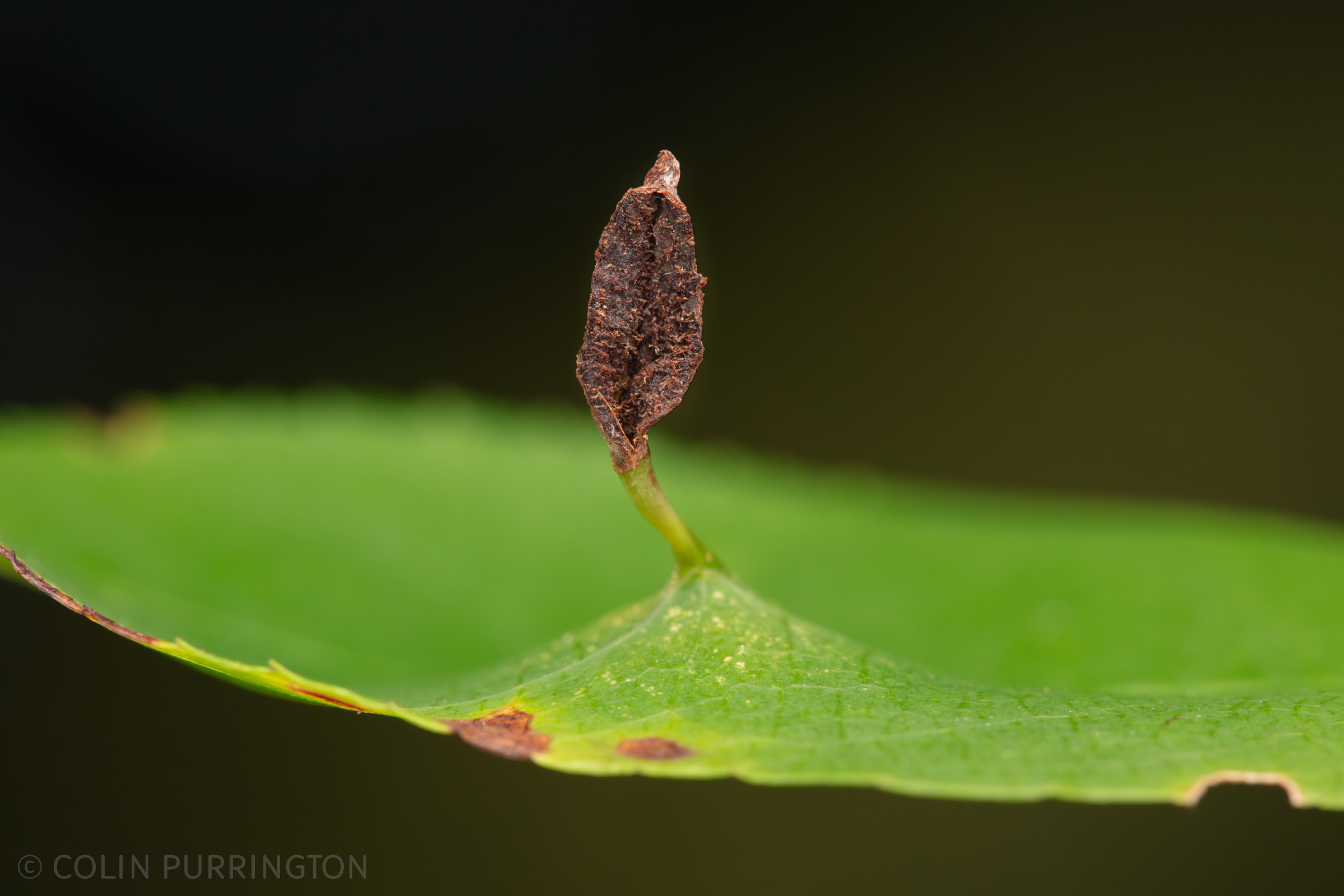 Black cherry leaf gall (Eriophyes cerasicrumena) that has split open and released the vermiform mites that have spent the summer inside. #GallWeek2025 #gall #galls #mites #cherry #prunus #biology #eriophyidae #macrophotography