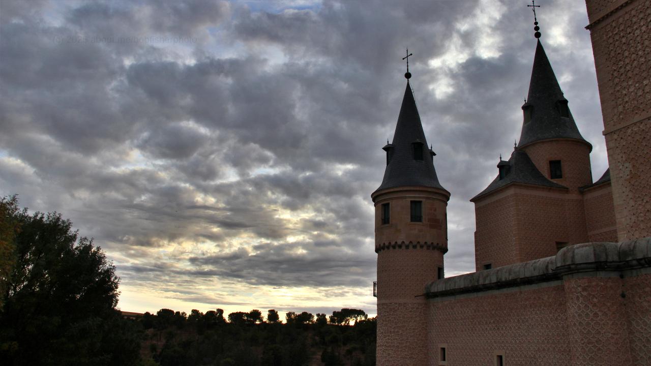 Nubes del principio del atardecer, tras dos de las torres del Alcázar de Segovia.