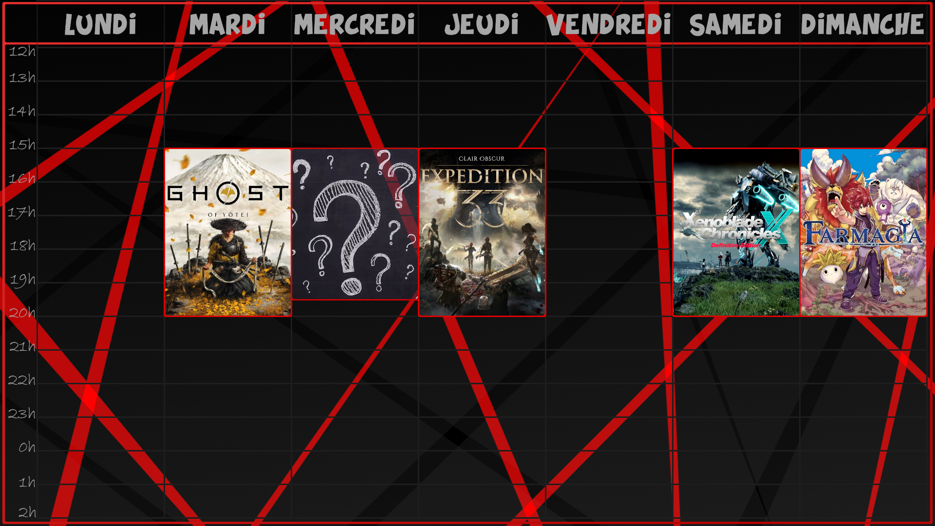 #lives #planning #streamplanning #streamer #streamerfr #streamfr #streaming #twitchfr #twitchstreamer #livestream #livestreamer #twitchaffiliate #letsplay #clairobscur #expedition33 #ghostofyōtei #xenoblade #xenobladex #xenobladechronicles