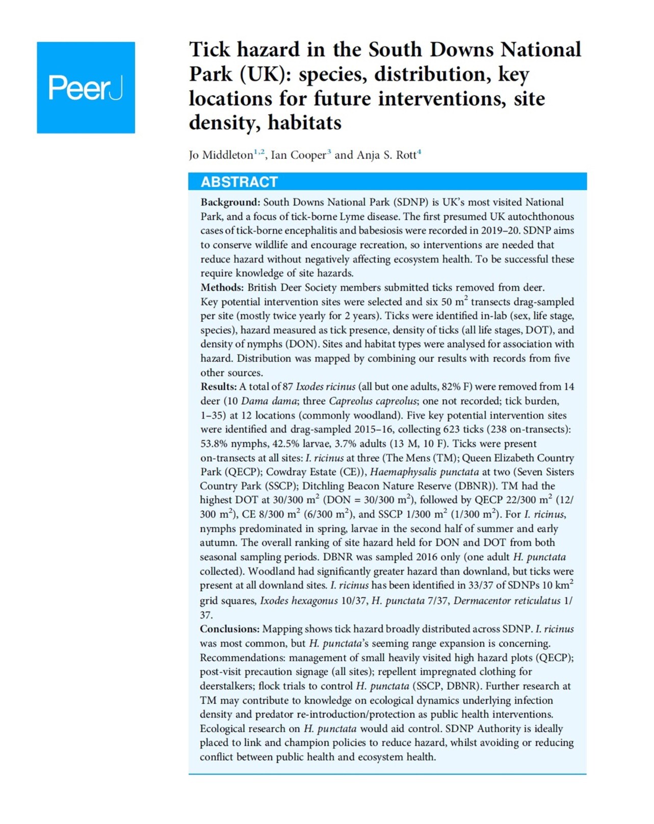 Paper by me (+ Cooper & Rott) on Tick hazard in the South Downs National Park (UK) + how to control without reducing ecosystem health. Free-to-read in @PeerJ at: https://peerj.com/articles/17483