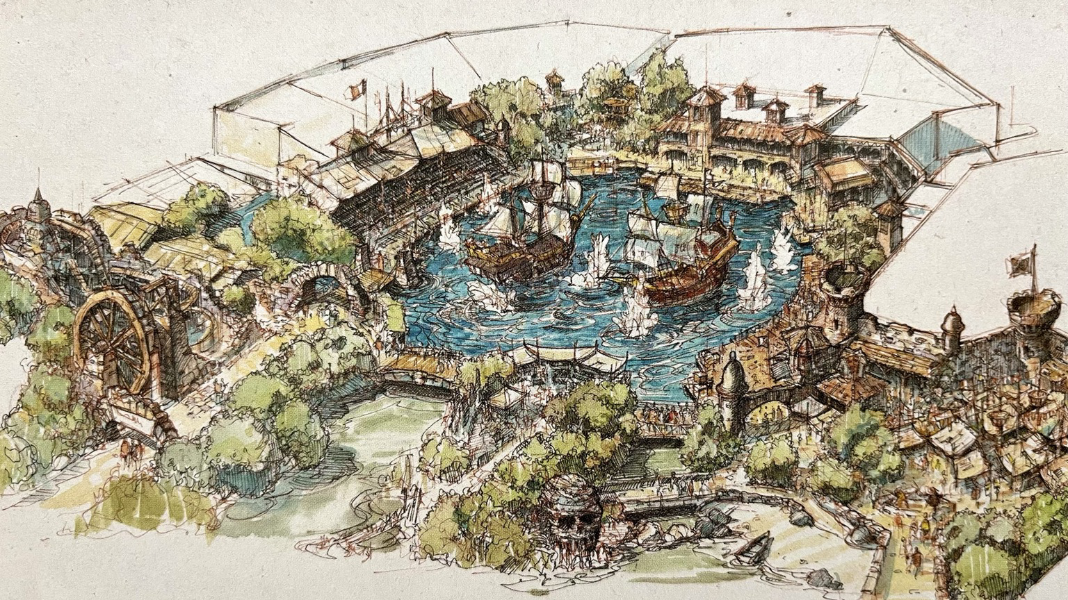 A #PiratesoftheCaribbean STUNT SHOW was proposed for #DisneylandParis, featuring a large pool with two ships battling, and even the old mill from #DeadMansChest! #ConceptArt by John Horny from 2007. 🏴☠️💥 #DLPtrivia