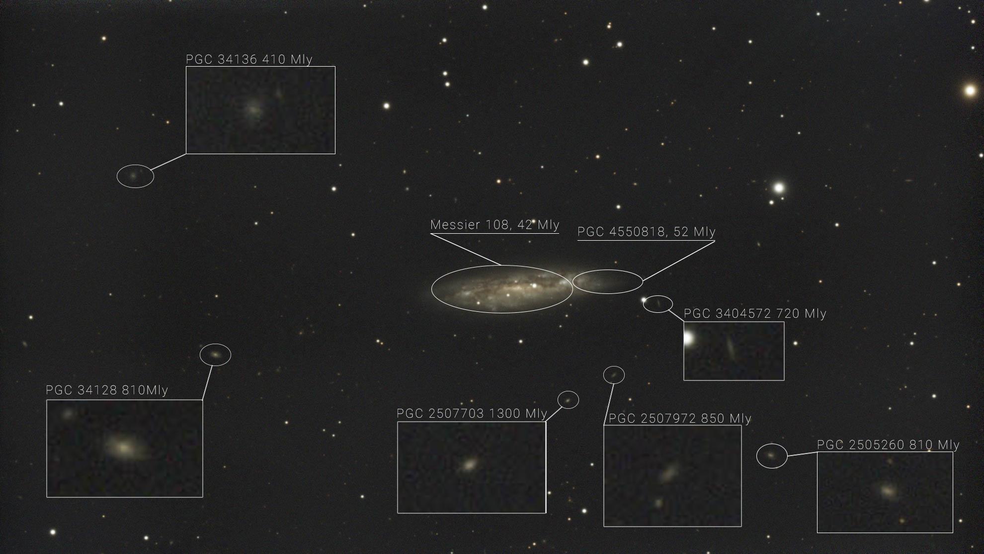 Messier 108, eine Spiralgalaxie im Sternbild Großer Bär, etwa 34 Mio Lichtjahre entfernt. Der Durchmesser von M108 beträgt rund 100.000 Lichtjahre. Die Galaxie wurde 1781 von Pierre Méchain entdeckt.