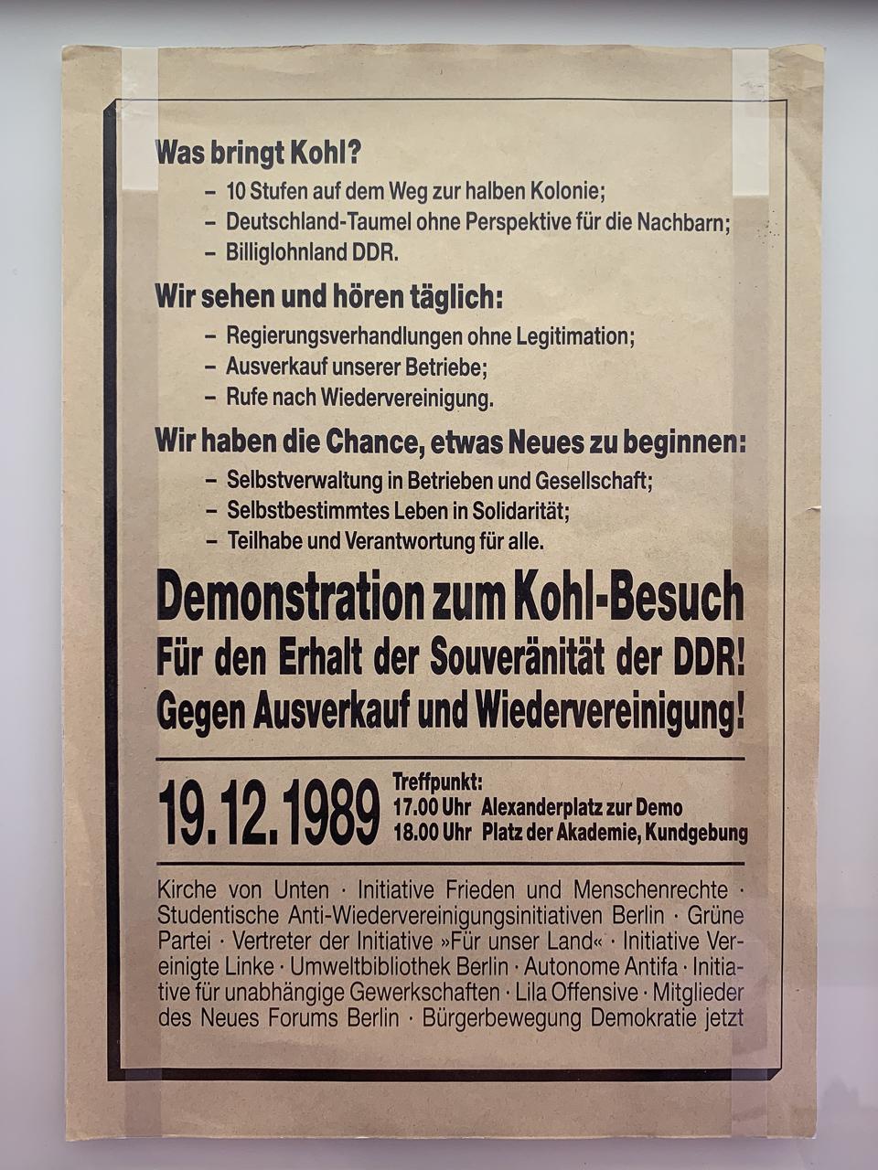 3/ Die Menschen, die die friedliche Revolution in der DDR gemacht hatten, waren aber überhaupt nicht unbedingt für eine #Wiedervereinigung, jedenfalls nicht auf die Art und Weise. Im Dezember kam Kohl in die DDR und wurde in Dresden mit fliegenden Fahnen, Deutschlandfahnen empfangen. Progressive Gruppen organisierten in Berlin eine Anti-Kohl-Demo. Siehe Demoaufruf.