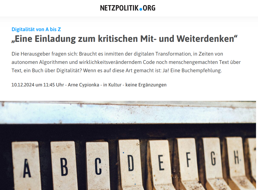 Seit heute Mittag ist eine wunderbare Rezension von "Digitalität von A bis Z" bei @netzpolitik_feed online 🦉 Ganz lieben Dank an Arne Cypionka! #digitalität #DigitalePhilosophie #digitalhistory #DigitalHumanities #medienwissenschaft #ästhetik