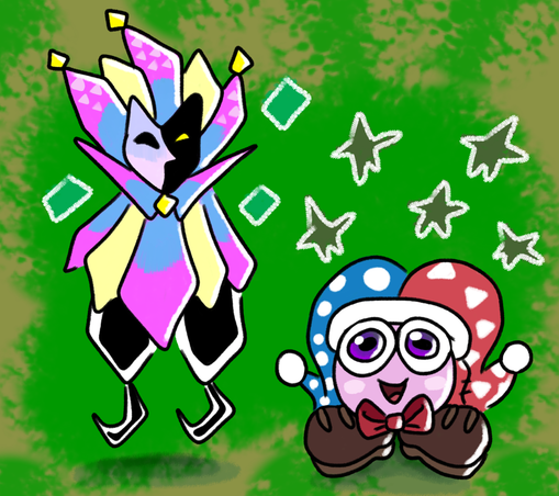 And another zine piece, for a Nintendo zine. I got very focused on a baking stream. #Art #MastoArt #Nintendo #NintendoArt #Kirby #MetaKnight #Landia #PaperMario #SuperPaperMario #Tippi #CountBleck #Dimentio #SuperDimentio