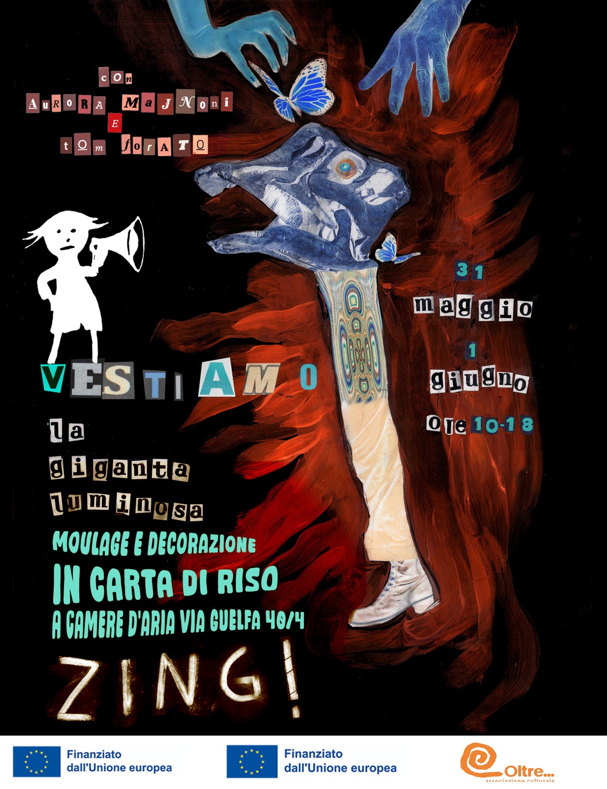 Due giorni di workshop intensivo condotto da Aurora Majnoni e Tom Forato per creare e confezionare il vestito della gigante luminosa Giselle, alta 3 metri, e prepararla per la passeggiata canora del CANTAGIUGNO [il 6 giugno!!], accompagnata dai canti di Zing!
