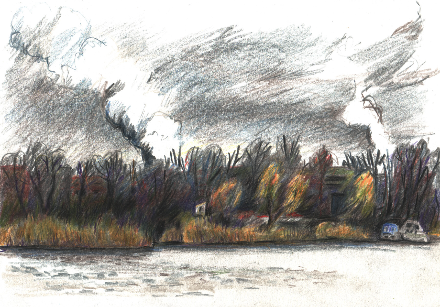 Spätherbstlicher Blick von Eiswerder nach Südosten #eiswerder #berlin #spandau #kraftwerkreuter #havel #landscapedrawing #pleinair #mastoart #art #pencildrawing #coloredpencil #coloredpencils #coloredpencildrawing #cityscape #haselhorst