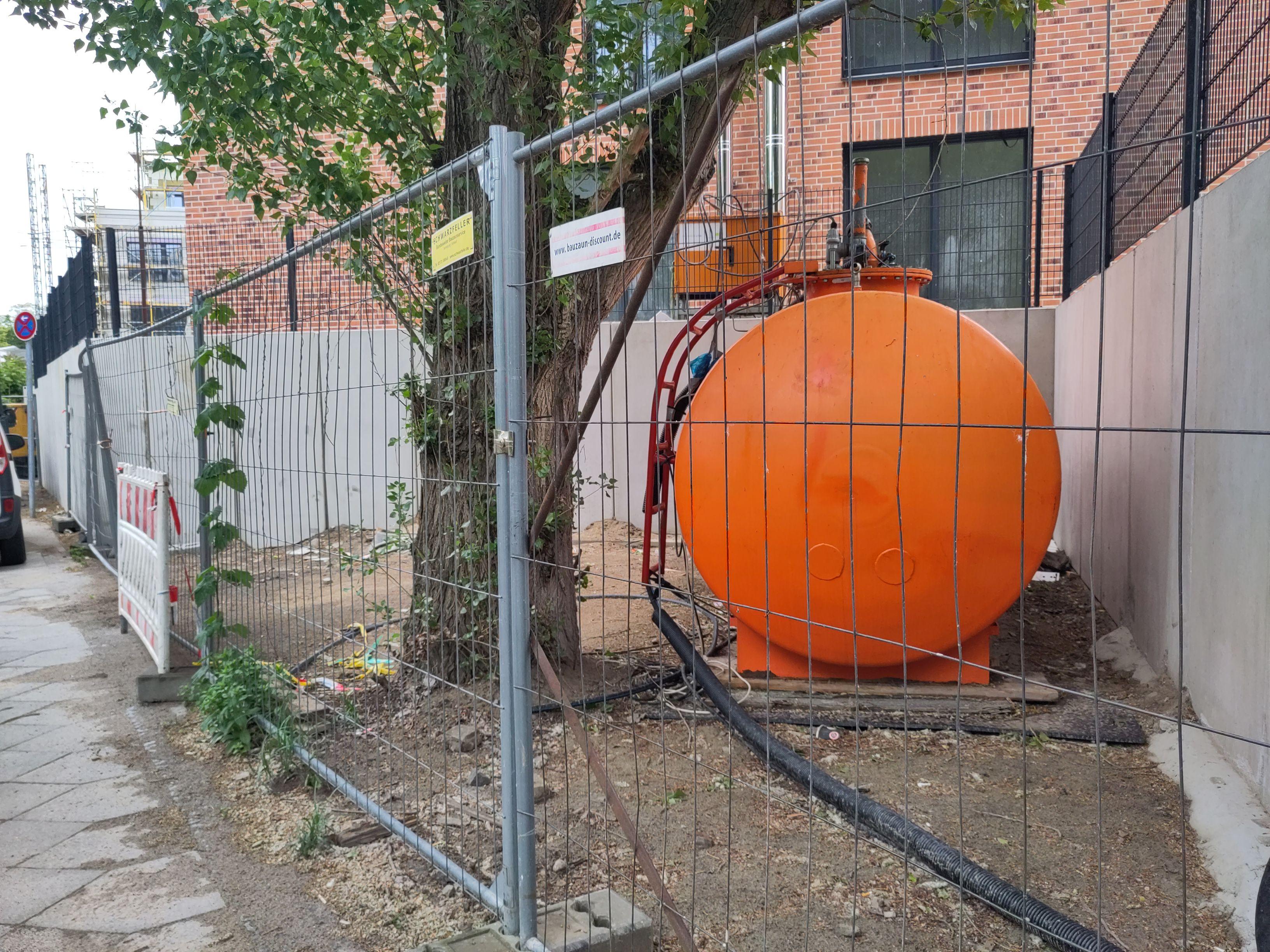 #Baustelle #Berlin #Eiswerder Hier ein schönes Beispiel dafür, wie man es NICHT machen sollte (und darf). Ein großer Tank wird direkt im Wurzelbereich eines Baumes, ohne Stammschutz und Lastverteilungsplatten aufgestellt (Die Holzbretter unter dem Tank sind eher ein Alibi).