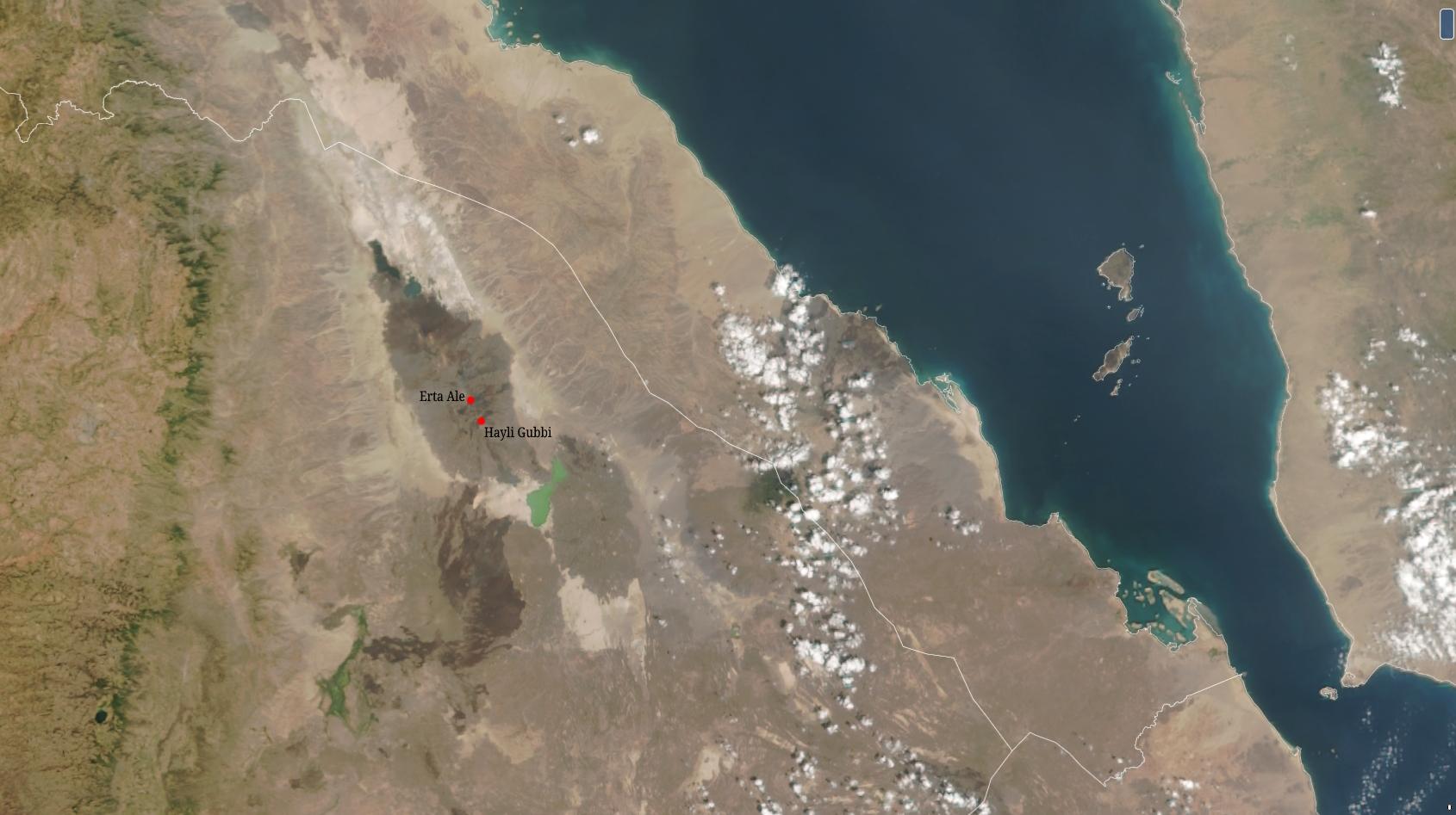 Nous évoquions dans kīpuka #11 la propagation d'une vaste intrusion magmatique sous les volcans Erta Ale et Hayli Gubbi, en #Éthiopie. Le magma est finalement sorti au niveau de ce dernier édifice hier ! D'après les premières données satellite, il s'agit d'une #éruption explosive, avec émission d'un panache de cendres. Voici quatre images détaillant cette activité :