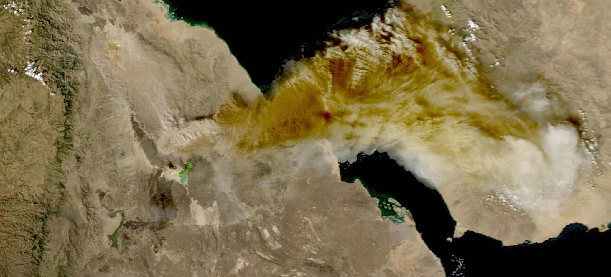 – La deuxième a été capturée le 23 à 11 h 10 UTC. On voit le panache de cendres se disperser selon deux directions : la partie basse va vers le nord, masquant les laves sombres, tandis que la partie supérieure, portée par des vents différents, va vers la mer Rouge à l'est.